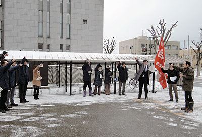 横手市職労は3月12日、冬に逆戻りしたような寒さのなか、本庁舎前で早朝職場集会を開催しました。