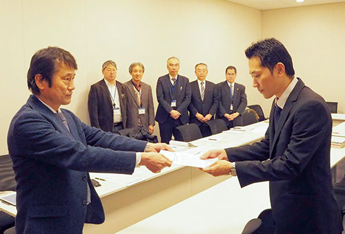 ▲要請書を渡す桜井眞吾自治労連副委員長(左)と被災地地方組織の仲間(奥)