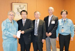 ▲左から、品川萬里市長、増田勝自治労連副執行委員長、笠原浩・福島県本部執行委員長、渡辺一芳郡山市職労執行委員長、柳沼英行総務部次長