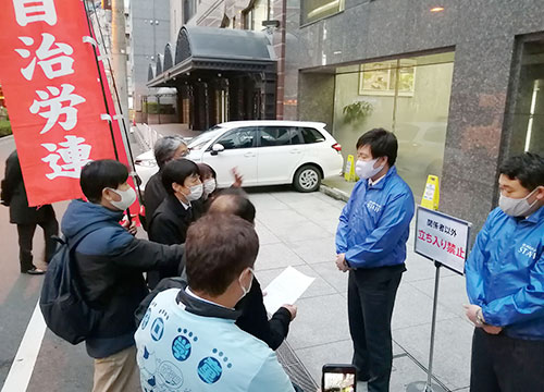 ▲12月3日に要請書を届けた仲間に対し、不誠実な対応をとる株式会社共立メンテナンス本社(右)
