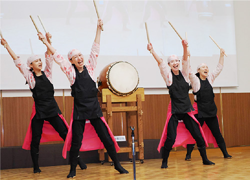 歓迎行事「和太鼓もも」 威勢よくお出迎え 北九州市職労保育部会の保育士を中心に活動する太鼓サークル「和太鼓もも」。結成から30年を超え今年で31年目。保育士メンバーで構成、定年後も続ける人、新たに若い人も加入しています。