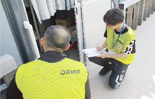 仮設住宅訪問調査で対話 能登半島ボランティア 能登半島地震支援ボランティアが、9月27~28日に実施され、全国から45人(うち自治労連22人)が参加しました。草刈りと仮設住宅訪問調査のグループに分かれて活動しました。仮設住宅に住む被災者からは「自宅の処分に困っている。仮設住宅は1年延長できたがその後が不安。公営住宅建設は10年後になると言われた」など切実な思いが語られ、復旧がすすんでいない状況が再確認されました。次回のボランティアは、11月8~9日に予定されています。