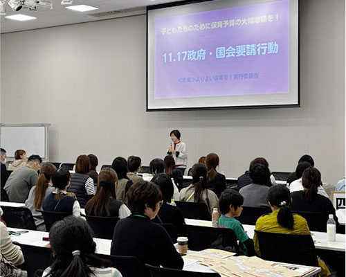 翌17日には政府・国会要請行動がとりくまれ、全国から250人(自治労連から50人)が参加。国会議員に「2025保育署名」の紹介議員になってもらうよう要請してまわりました。政府・国会要請行動は引き続き、来年2月5日にも予定されています。