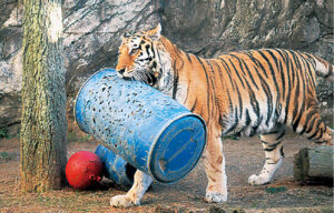 ▲トラの仲間で一番大きなアムールトラ。夏には水あびするところが見られるかもしれません