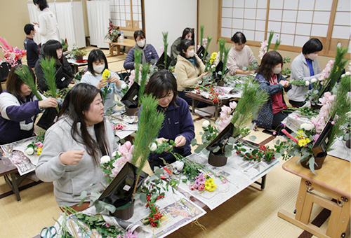 世界で一つだけのデザイン 京都・京丹後市職労 京都・京丹後市職労は昨年12月に2回のフラワーアレンジメント教室を開催し、あわせて60人が参加しました。年末恒例行事として組合員が楽しみにしている企画です。クリスマス用とお正月用、いずれかつくりたい種類を選択することができます。参加者からは「今年もいいできになりました」「自分で作る楽しみも魅力」などの声が寄せられました。和気あいあいと話しながらも真剣に花と向き合い、一人ひとり違ったすてきな作品が並びました。