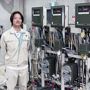 私は2021年に採用され、現在は浄水場に勤務しています。住民が安心して水道水を使用できるように、施設の運転にあたっては水質管理の薬品での数値の変化を見逃さないなど、細心の注意を払っています。
