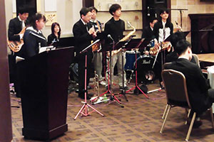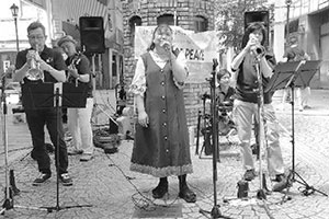岡山市職労の行事への参加も大切な活動のひとつです。新入職員歓迎会や、庁舎での被災者支援コンサートなどのイベントに数多く参加しています。昨年6月には戦後80年の節目の岡山市平和の日(岡山大空襲の日)に商店街で開催された平和イベントにも参加。戦争の時代をモチーフにしたジャズの楽曲を演奏し、戦争体験者の語りや、空襲紙芝居といった演目の方々とステージを共にしました。「平和あっての音楽活動。今のありがたさを静かに見つめ直す時間となりました」と小西さん。
