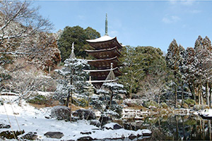 ▲雪化粧したレアな瑠璃光寺五重塔(2月10日撮影)