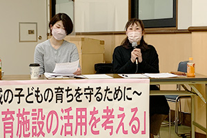 ▲大阪自治労連・大阪保育運動連絡会・保育研究所共催の「公立保育施設の活用を考える」公開シンポジウムで報告する牧野谷さん(2022年2月27日、写真右)
