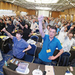 女性の大会参加比率は昨年を上回る32%。発言は4つの補助組織と33地方組織3県事務所から計66人、1部会から文書発言があった。