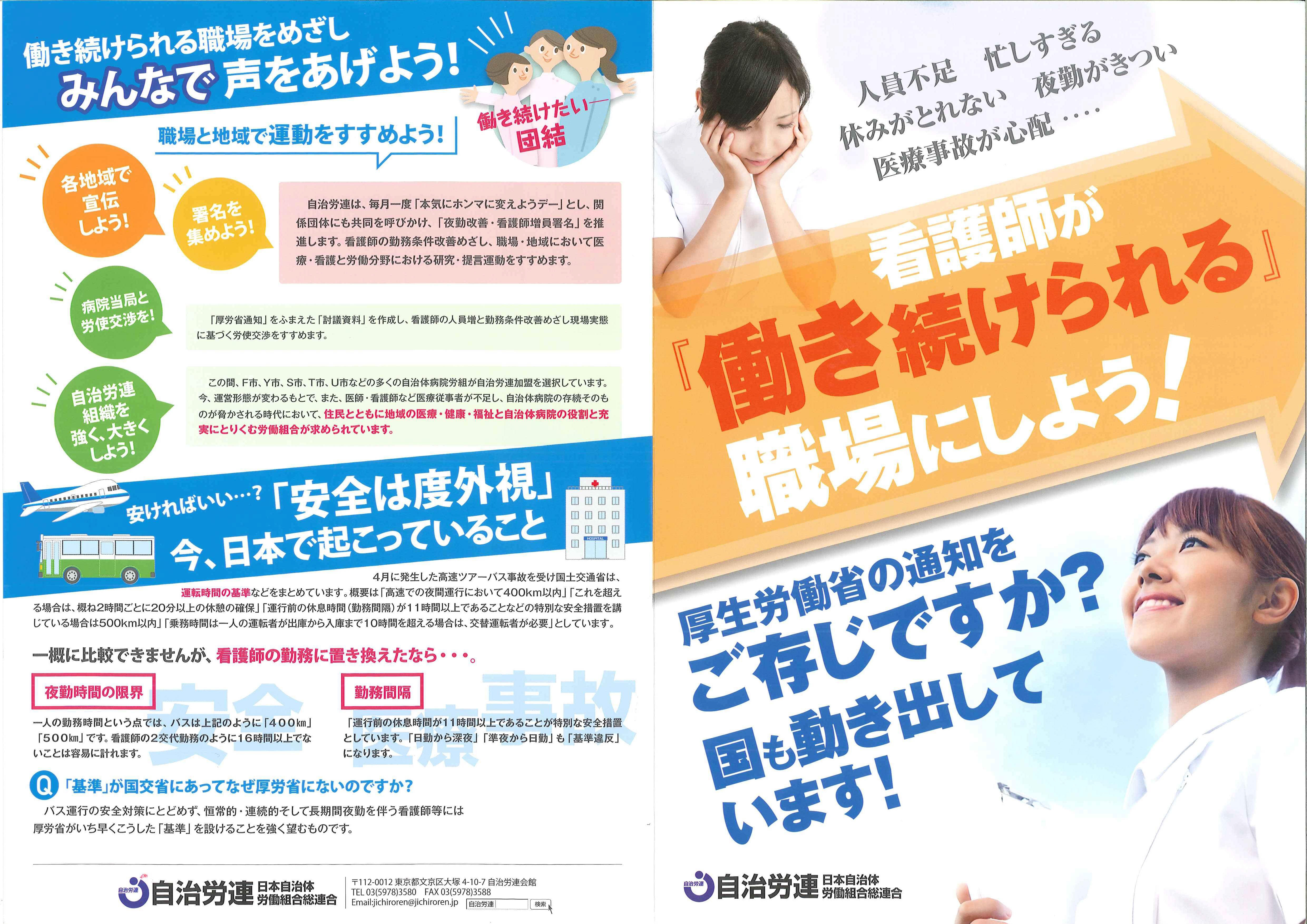 この調査結果と厚労省通知を生かし、職場・地域から看護・介護の人員増を求めるとりくみ、具体的には「夜勤改善・看護師増員署名」の推進、「看護師の人員増と勤務条件の改善を目指した労使交渉の配置」等をすすめていくため、このたび、自治労連は、標記、組合員用リーフレットを新たに作成しました。積極的な活用をお願いいたします。