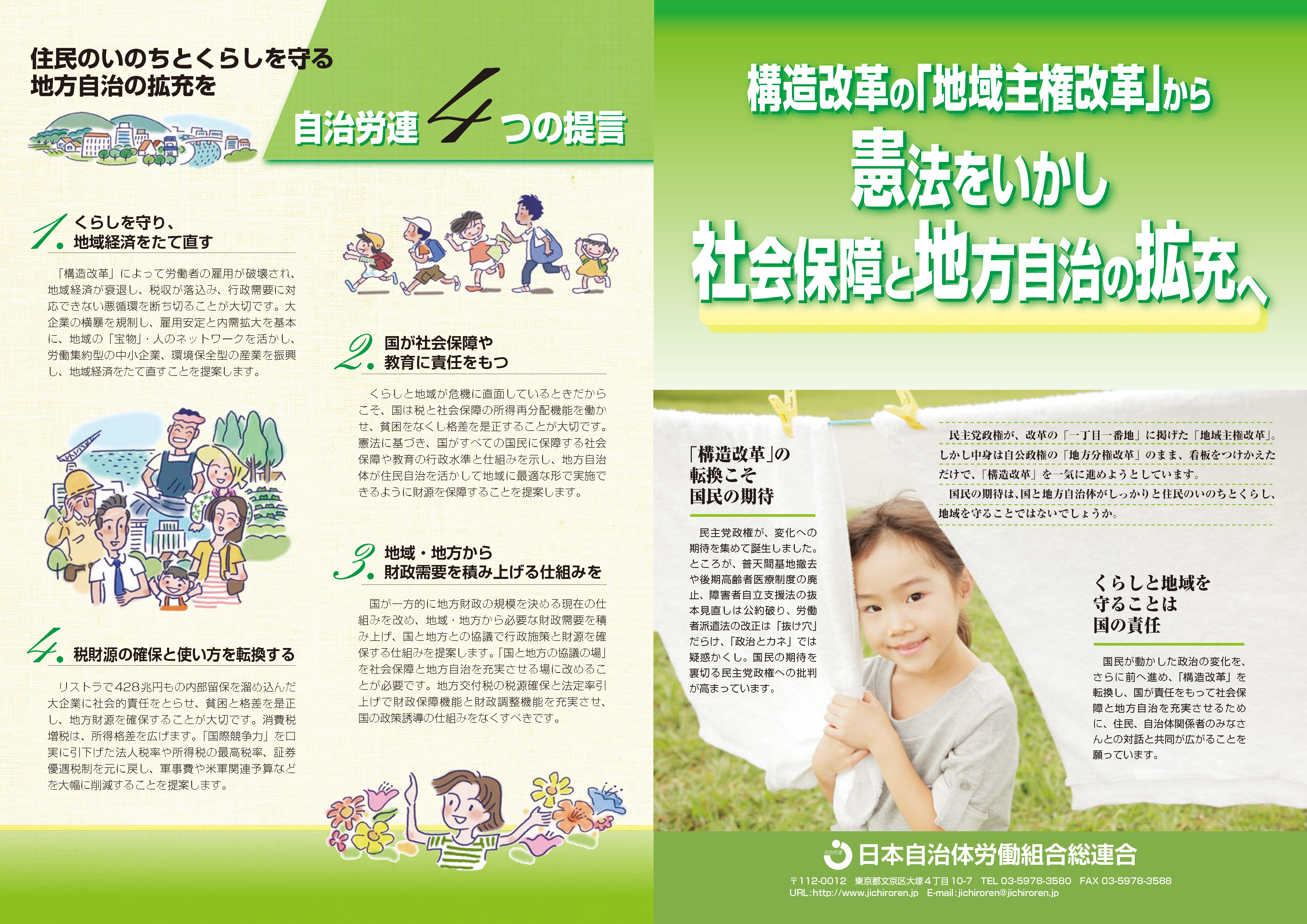自治労連ではリーフレット「構造改革の『地域主権改革』から、憲法をいかし社会保障と地方自治の拡充へ」を作成しました。職場での学習はもとより、自治体関係者・住民団体等との対話・懇談等に、幅広くご活用ください。